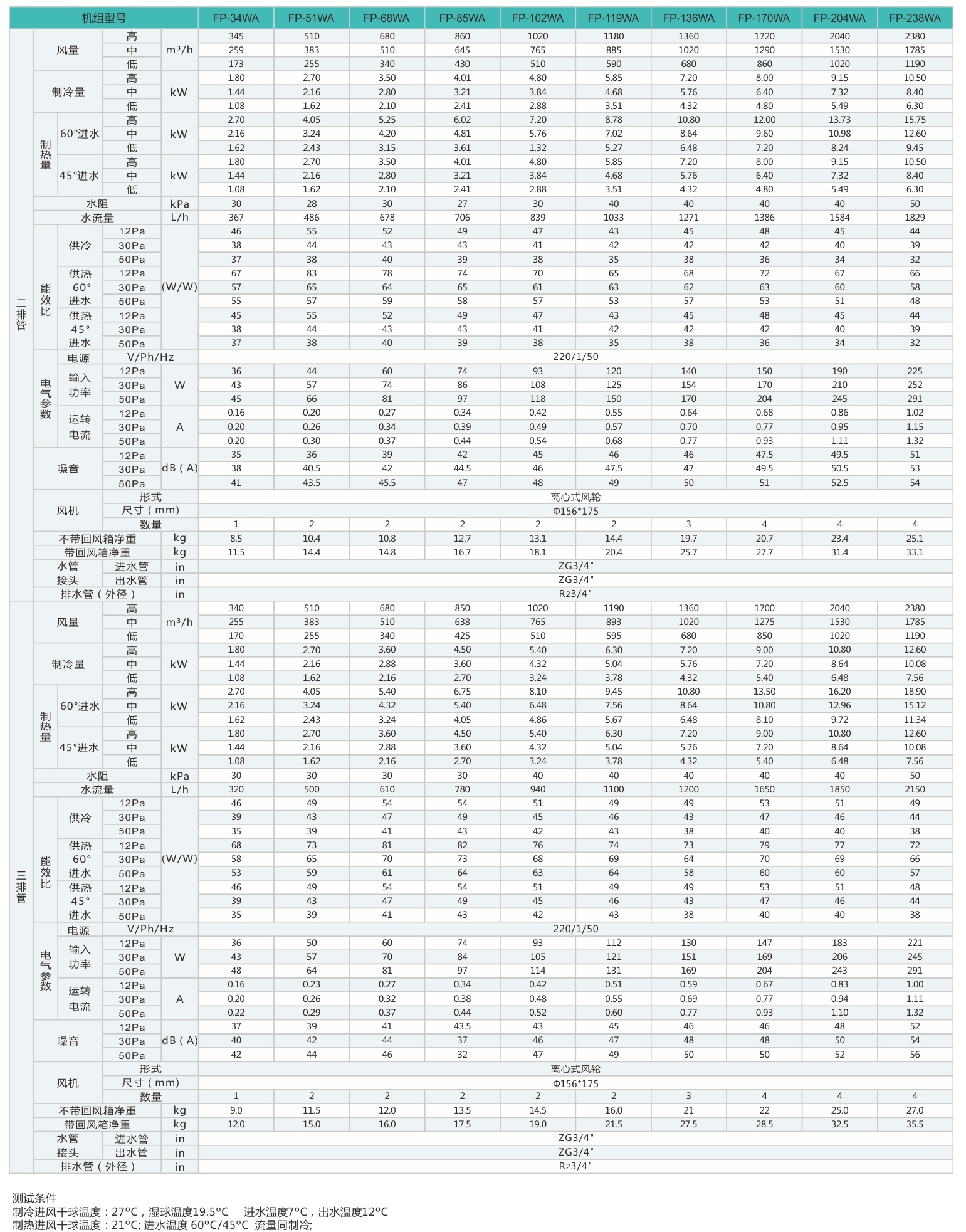 供冷量是在進風干球溫度27℃,濕度溫度19.5℃,進水溫度7℃,出水溫度12℃條件下測試所得。